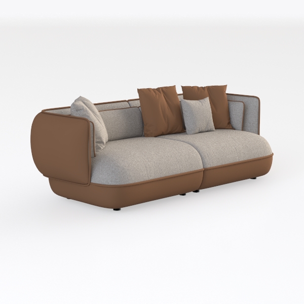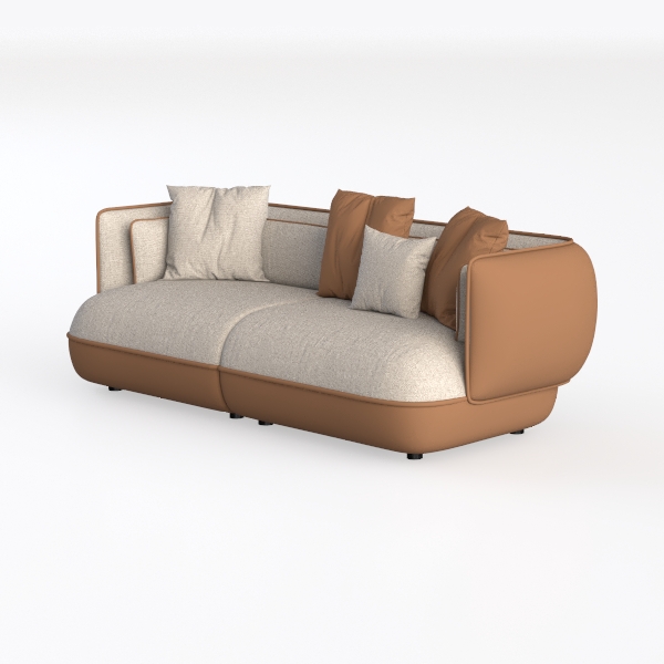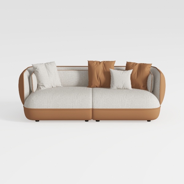 This sofa draws design inspiration from organic forms and the quiet elegance of natural materials, with its softly curved armrests and flowing silhouette evoking the gentle undulations of a coastal landscape or a sculptural piece of furniture. The main body features a textured bouclé fabric in a warm oatmeal hue, offering a tactile softness that invites touch, while the smooth terracotta leather-like trim along the edges adds a subtle contrast, enhancing the sofa’s polished look. Visually, its neutral base with warm accents creates a calm, versatile backdrop—light catches the fabric’s texture, casting soft shadows that highlight its understated design.