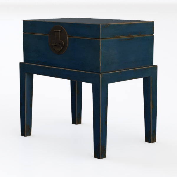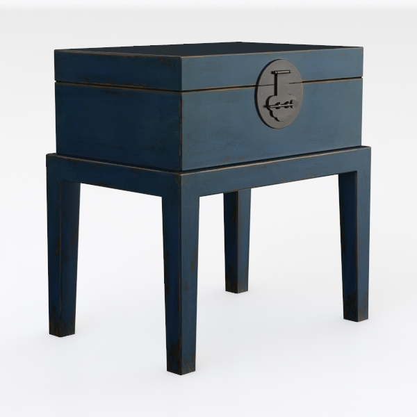 Inspired by traditional Chinese storage chests, this blue wooden cabinet features warm, weathered tones with a smooth, slightly textured surface. Its rich hue catches light softly, adding depth. Ideal for minimalist or traditional bedrooms, pairing with linen bedding and ceramic vases, or mid-century living rooms with wooden floors. Spacious top and deep drawer offer ample storage, blending style and function.