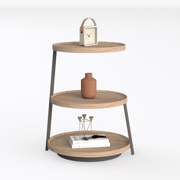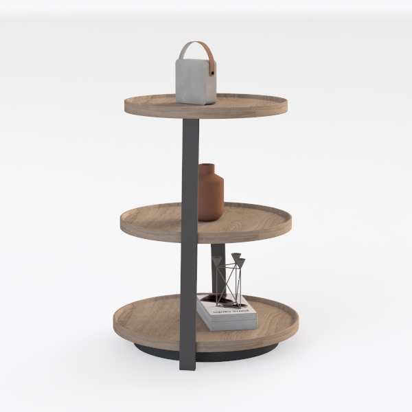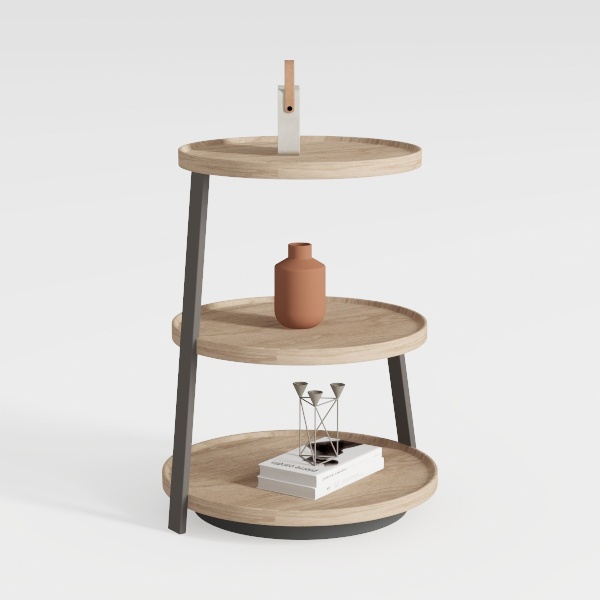 Inspired by natural organic forms, this three-tiered wooden shelf features warm, smooth surfaces with visible grain, paired with sleek black metal legs for contrast. Light yet stable, it creates a balanced, airy look, ideal for modern minimalist living rooms or bedrooms. Three circular tiers offer ample space for books, decor, or small plants, blending functionality with understated elegance.