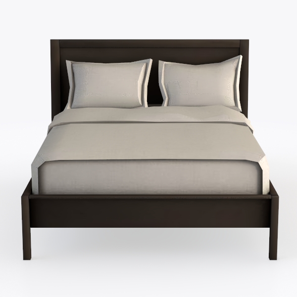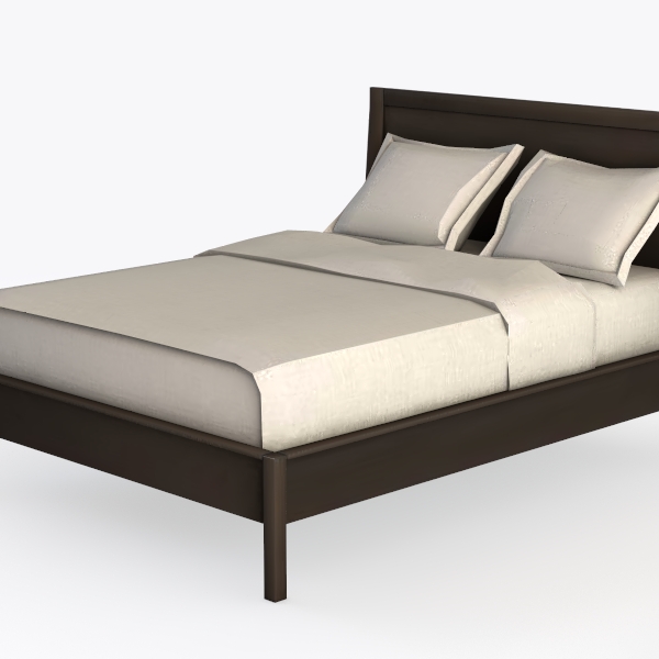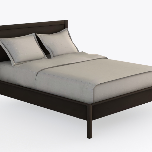 Inspired by minimalist Scandinavian design, this bed features a smooth dark wood frame with clean lines and neutral tones. Soft light gray linen sheets and two textured pillows enhance the serene, cozy feel. Sturdy and stable, it fits seamlessly into modern or Scandinavian bedrooms, complementing warm wood accents and soft lighting, offering both style and comfort.
