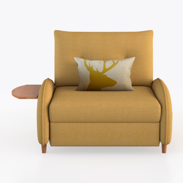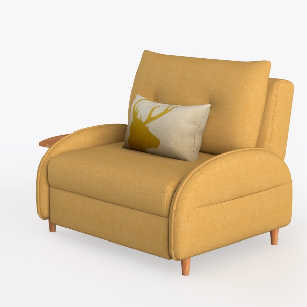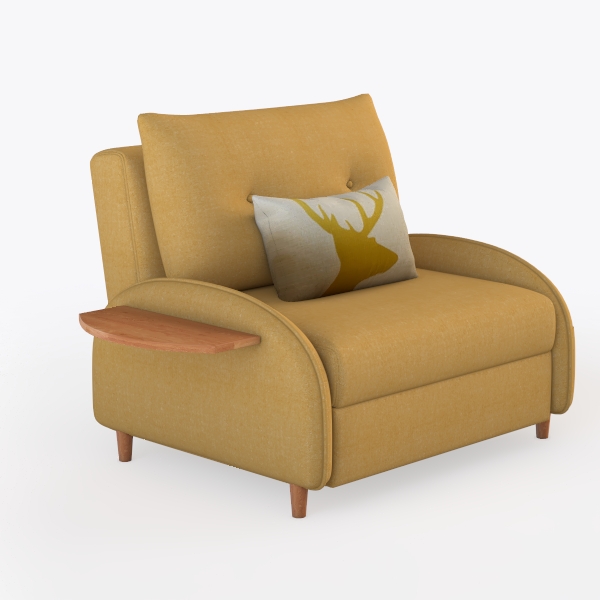 Crafted with a soft, textured mustard-yellow upholstery, the fabric feels gentle and breathable against the skin, inviting you to sink in and unwind. Subtle button tufting on the backrest adds a touch of classic elegance, while the smooth, slightly curved armrests cradle your arms, enhancing the sense of coziness. The rich, polished wood of the integrated side table and tapered legs contrasts beautifully with the warm hue, creating a harmonious blend of natural warmth and understated sophistication that softens any room’s atmosphere.