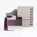 Inspired by the need to blend functionality with playful charm, this integrated furniture piece transforms small spaces into organized, inviting zones. Its sleek silhouette features soft matte gray surfaces, complemented by vibrant magenta accents that add a lively yet balanced touch—edges are smooth to the touch, with a subtle sheen that catches light gently, avoiding harsh glare. The dual-level design maximizes vertical space: above, a cozy sleeping area with a plush pillow invites rest, while below, a compact desk with a sloped surface offers a dedicated workspace. Integrated storage cabinets with slim handles and open shelves to the right keep essentials within reach, while the staircase, with a small drawer at its base, doubles as a handy storage spot. Ideal for a modern kids' room or urban apartment, it pairs beautifully with warm wooden elements, soft pastels, and geometric rugs, enhancing its contemporary vibe. Whether for a child’s creative retreat or a minimalist living solution, this unit merges comfort, storage, and style seamlessly.