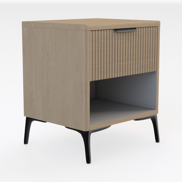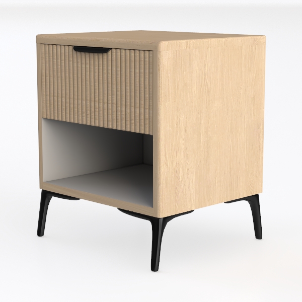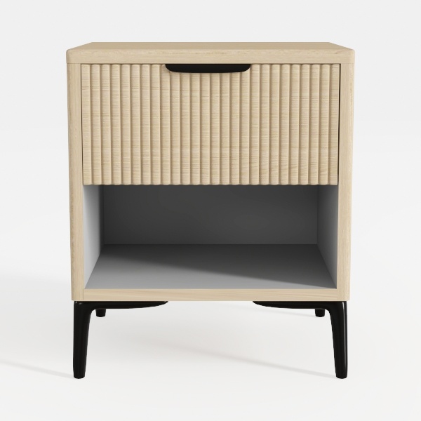 Inspired by coastal minimalism, this bedside cabinet blends light oak warmth with woven texture, creating a tactile, airy feel. Its clean lines and open lower shelf add simplicity, perfect for serene bedrooms—pair with a minimalist bed and potted greenery. A spacious drawer and open shelf offer practical storage for bedtime needs.