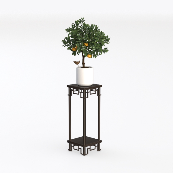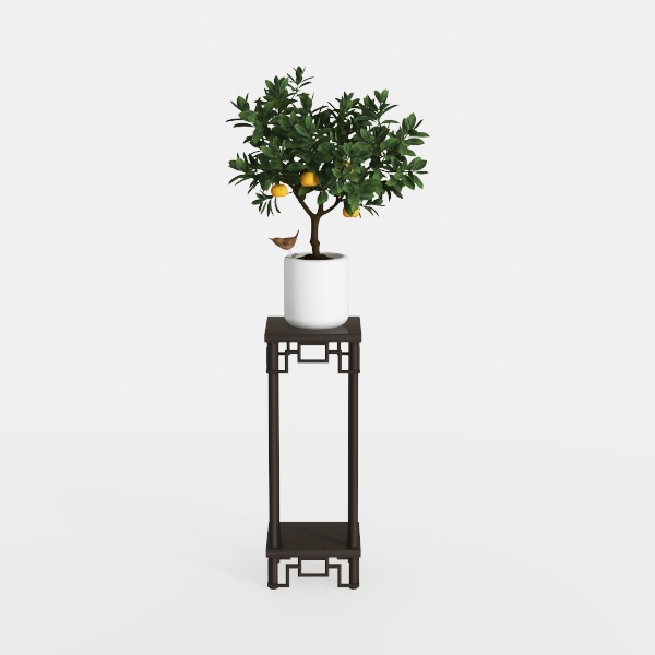 Inspired by classical Chinese garden aesthetics, this piece blends traditional craftsmanship with natural charm. The dark wooden plant stand features intricate geometric cutouts, its smooth surface offering a warm touch, while the crisp white pot contrasts beautifully with the vibrant green foliage and golden fruits of the potted citrus tree. Perfect for a serene living room or study, it adds an elegant, nature-infused vibe to minimalist or traditional spaces, with a lower shelf providing extra decor space.