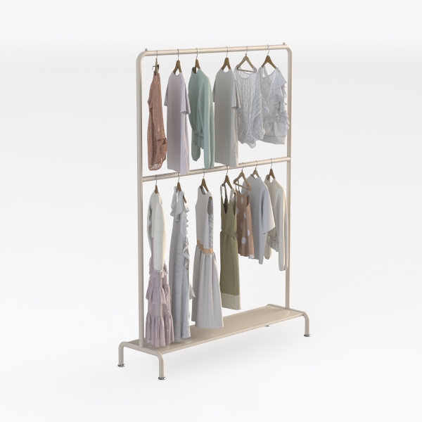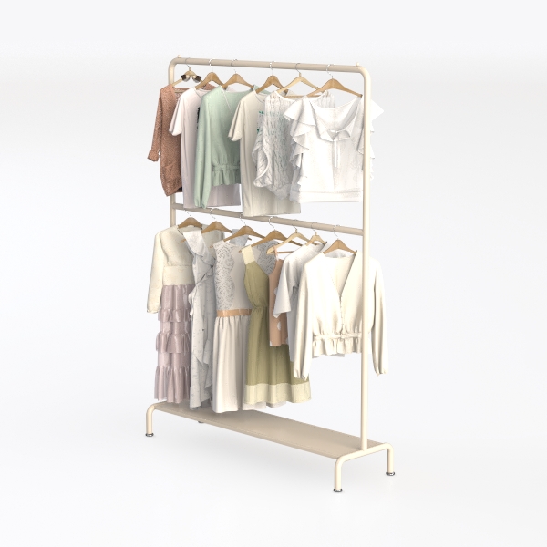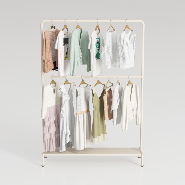 Inspired by modern minimalism, this clothing rack features a sleek white metal frame. Its lightweight structure contrasts with soft, flowing fabrics—cotton, lace, and chiffon create a tactile blend of crispness and softness. Ideal for a serene bedroom or walk-in closet, blending Scandinavian style with bohemian charm. Double-tiered design maximizes storage, keeping your space uncluttered.