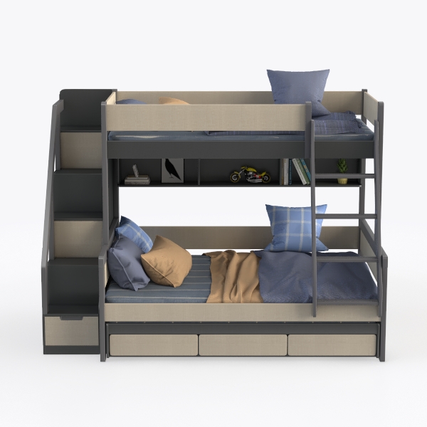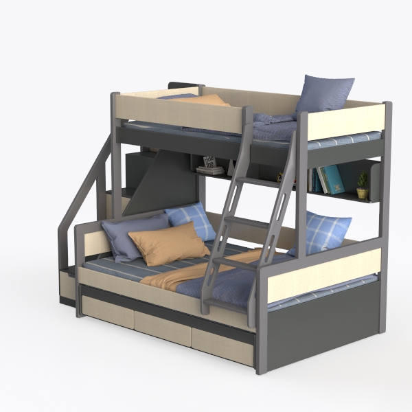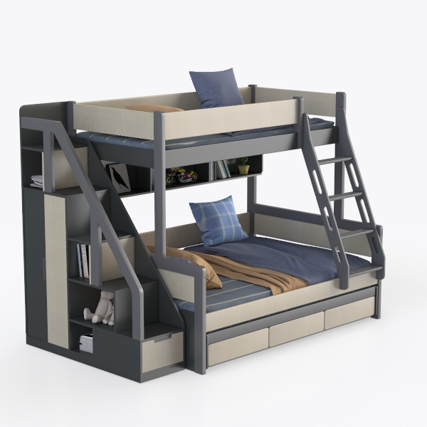 Designed to maximize shared space in family homes, this bunk bed features sleek gray frames and soft, textured fabrics. Its neutral palette of beige, blue, and warm browns creates a cozy, modern vibe. Perfect for children’s rooms or family bedrooms, pair it with wooden nightstands and playful wall art. Integrated storage drawers and a built-in bookshelf under the top bunk offer ample space for toys and books, with a sturdy staircase ensuring easy access.