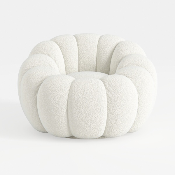 This plush armchair embodies a blend of organic inspiration and modern comfort, its design echoing the gentle curves of blooming flowers or puffy clouds. The soft, rounded silhouette feels both whimsical and grounded, as if crafted from a single, billowing piece of fabric that wraps around the body.