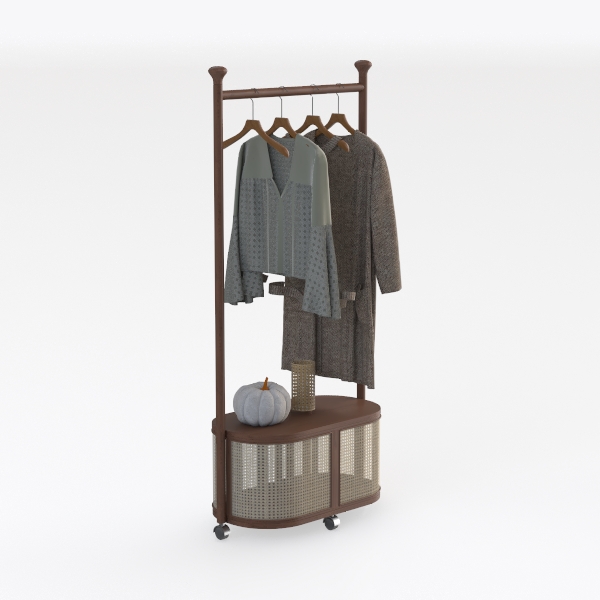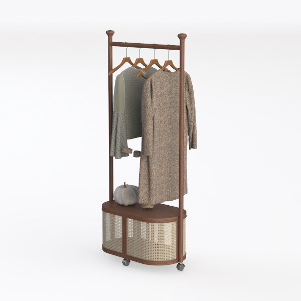 Crafted from natural elements, its design blends rustic warmth and modern simplicity. Warm wooden frames contrast with textured rattan detailing, creating a soft, inviting vibe—smooth surfaces and subtle weaves add tactile charm. Ideal for a cozy bedroom or entryway, it complements minimalist, Scandinavian, or bohemian styles, pairing well with marble accents or woven rugs. The curved base holds small decor like vases, while hanging rods organize coats, with wheels for easy mobility.