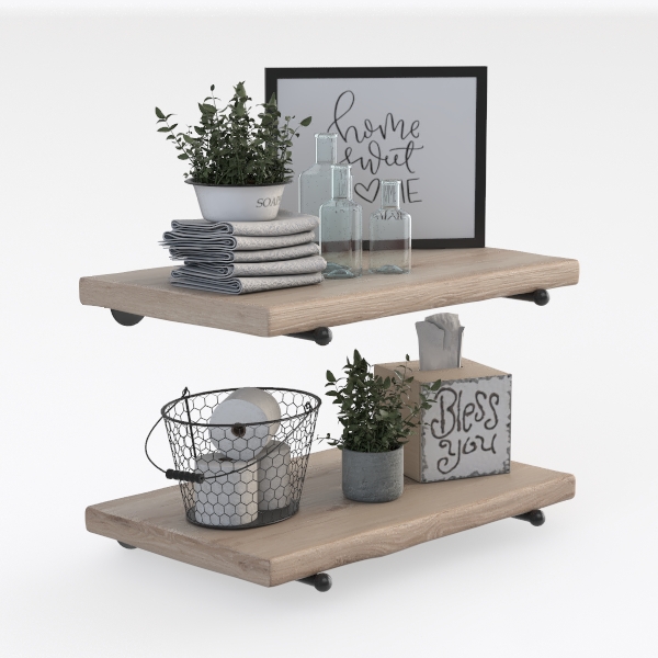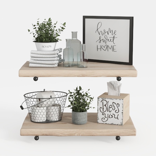Inspired by cozy, natural home vibes, this two-tier wooden shelf blends warm, smooth wood tones with fresh greenery and soft textures. Clear glass bottles and a "home sweet HOME" sign add lightness, while a metal wire basket neatly holds essentials, balancing rustic charm and modern simplicity. Ideal for a minimalist bathroom or small powder room, it elevates routines with practical storage and a welcoming, lived-in feel.