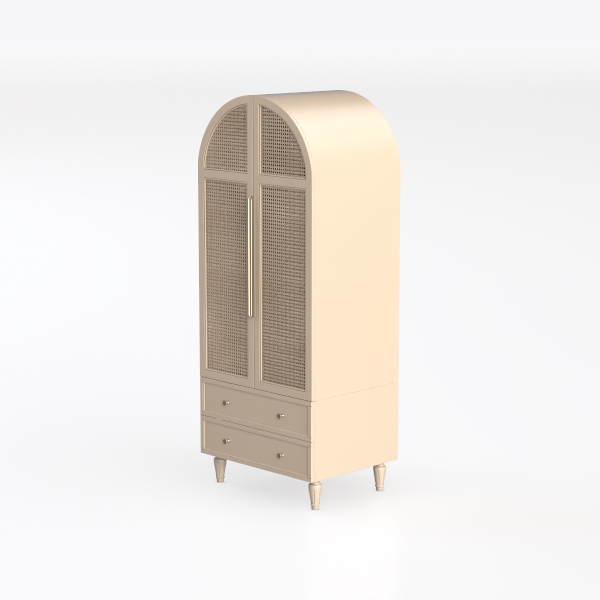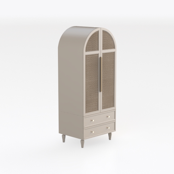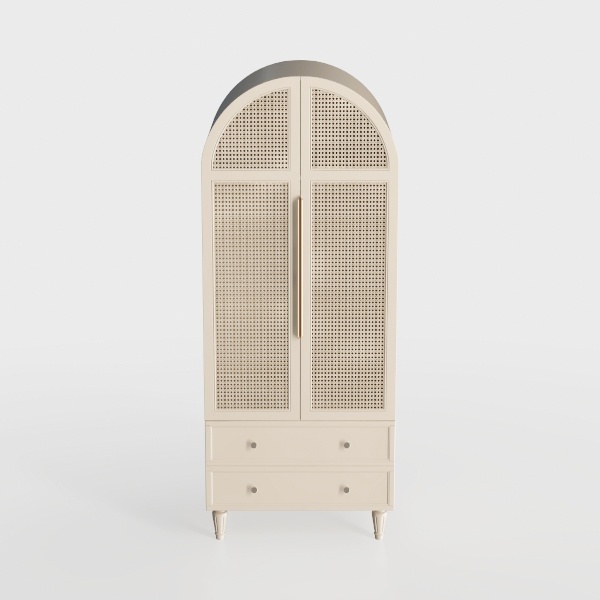 Inspired by natural weaving and mid-century minimalism, this wardrobe features light rattan panels with a delicate, airy texture, complemented by smooth wooden frames and a soft off-white finish. It’s perfect for a bohemian or modern bedroom, pairing beautifully with marble nightstands and potted plants. The spacious interior includes hanging rods and two drawers, offering ample storage with a streamlined look.