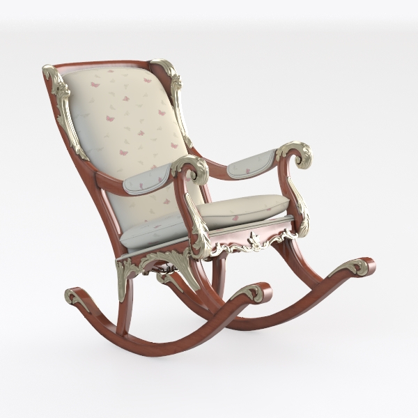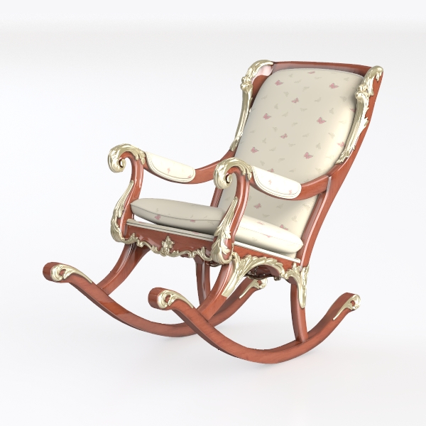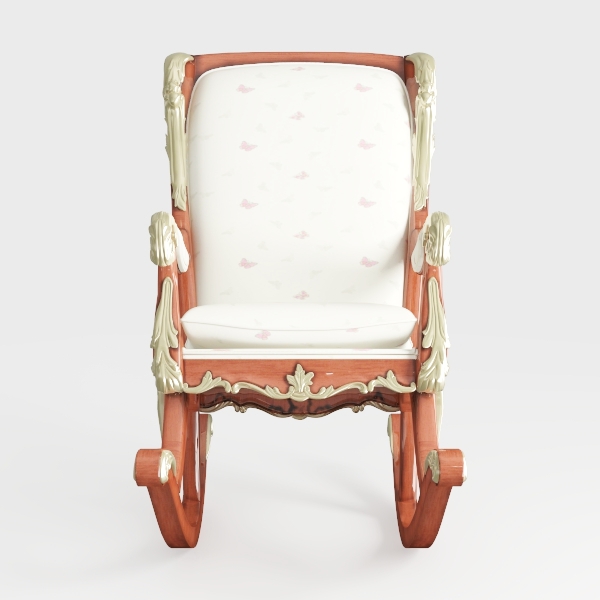 Inspired by vintage craftsmanship, this rocking chair blends intricate carved wooden frames with soft white upholstery adorned with pink floral patterns. Warm wood grains and plush cushions create a cozy, tactile feel, perfect for a romantic bedroom or elegant living room, pairing beautifully with marble side tables and vintage lamps. The gentle rocking motion and supportive backrest offer a serene, relaxing experience for quiet moments.
