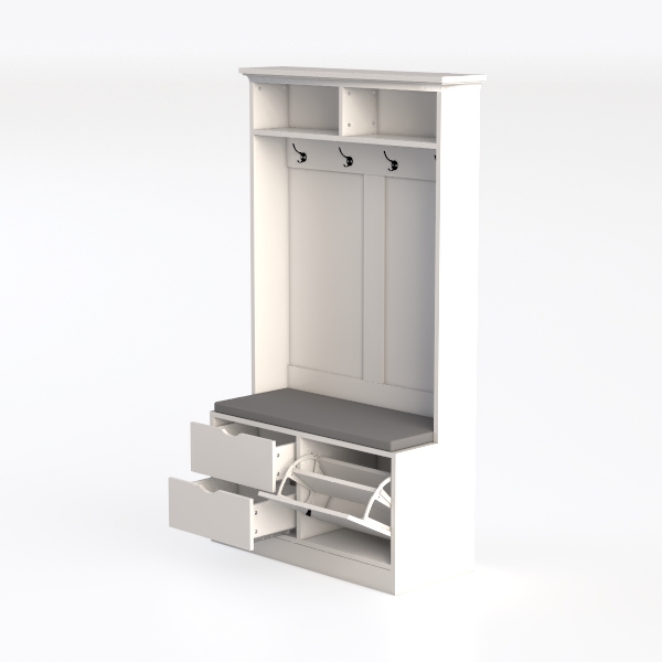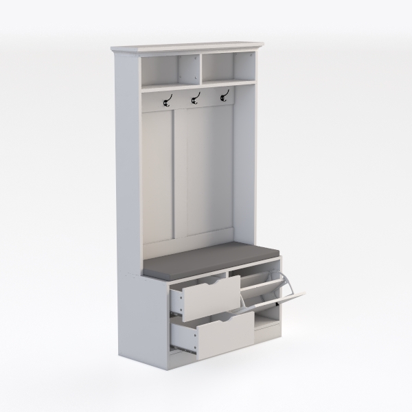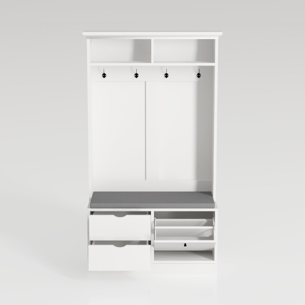 Designed for streamlined entryways, it blends minimalist aesthetics with practical storage. Sleek white surfaces, smooth to the touch, contrast with a soft gray padded bench, creating a clean, airy look. Above, four hooks hold coats and bags; below, two drawers and open shelves stow shoes and essentials. Perfect for modern, Scandinavian, or small-space settings, balancing style and utility seamlessly.