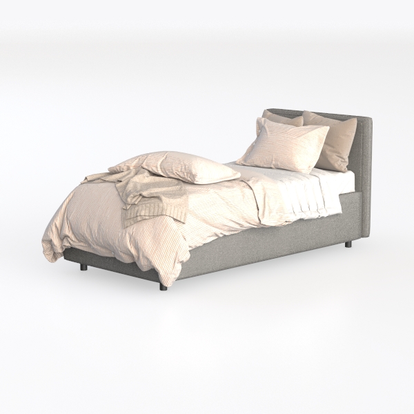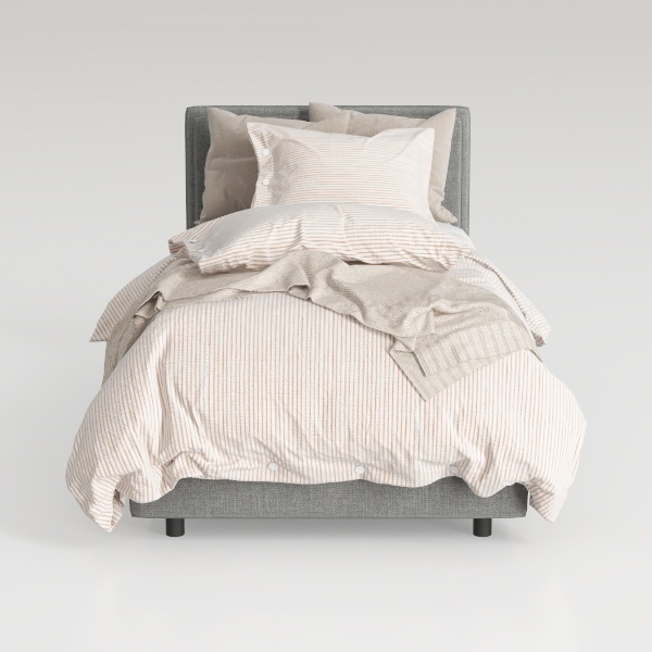Inspired by the calm of minimalist design, this bed blends a soft, upholstered headboard with warm neutral striped linen bedding. Its light, airy look creates a serene atmosphere, perfect for a Scandinavian or modern bedroom, pairing well with wooden nightstands and soft lighting. A sturdy frame and deep, padded headboard offer excellent support, ensuring cozy, restful nights in this functional, stylish piece.