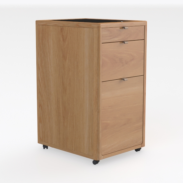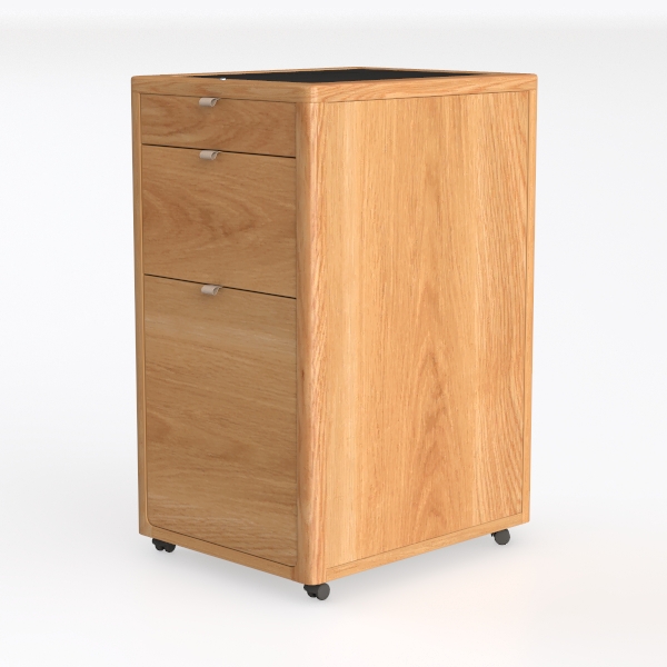 Inspired by nature's warmth and minimalist living, blending practicality with organic charm. Its light oak finish features smooth, grainy textures that reflect soft light, creating a warm, inviting look. Perfect for Scandinavian or Japanese-inspired spaces, it fits a study nook or bedroom, complementing sleek desks and woven chairs. Three drawers with metal pulls, on casters for easy mobility, offer ample storage for stationery or daily essentials.