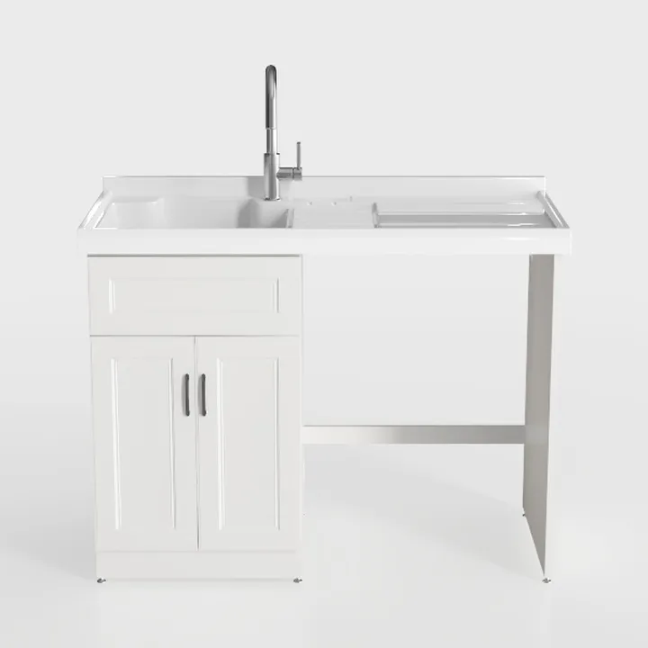A 3D model of a Laundry Sink Cabinet, featuring white, durable material with integrated sink, cabinet, and drawer and a minimalist modern aesthetic. It has low polygon count and is suitable for home laundry rooms, kitchens, or balconies.