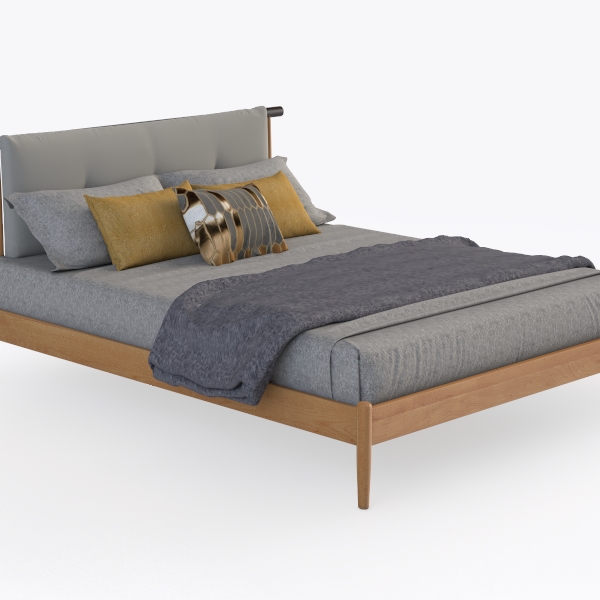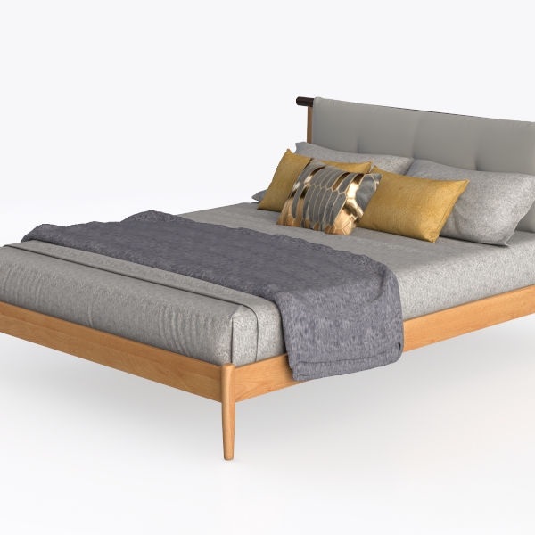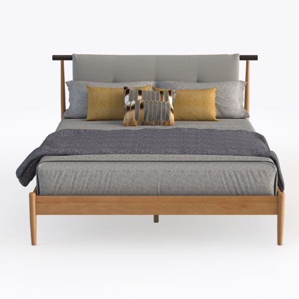 Inspired by nature and minimalism, this bed frame features a soft gray upholstered headboard and warm wooden slats, with textured golden and striped cushions adding depth. Its clean lines and neutral tones create a calm, inviting vibe, perfect for modern minimalist or Scandinavian bedrooms, pairing beautifully with marble accents and sheer curtains. The sturdy wooden base offers steady support, while the padded headboard ensures ultimate coziness.