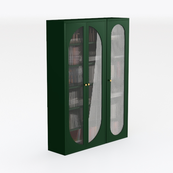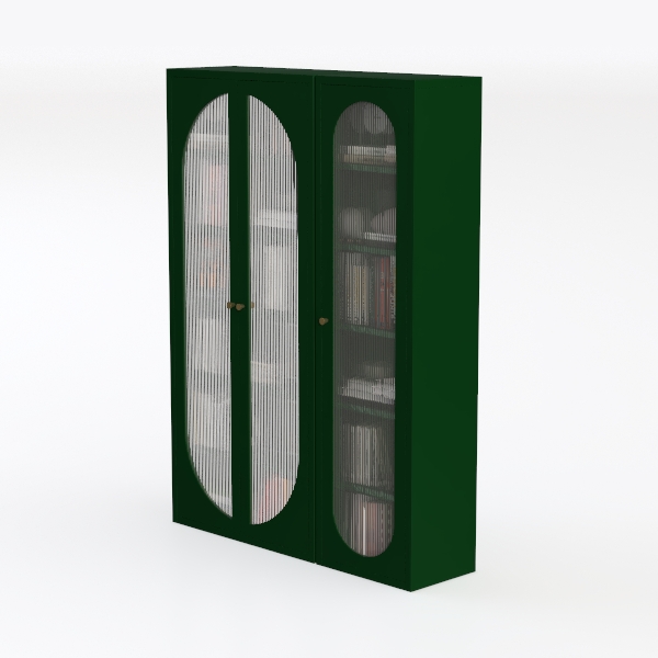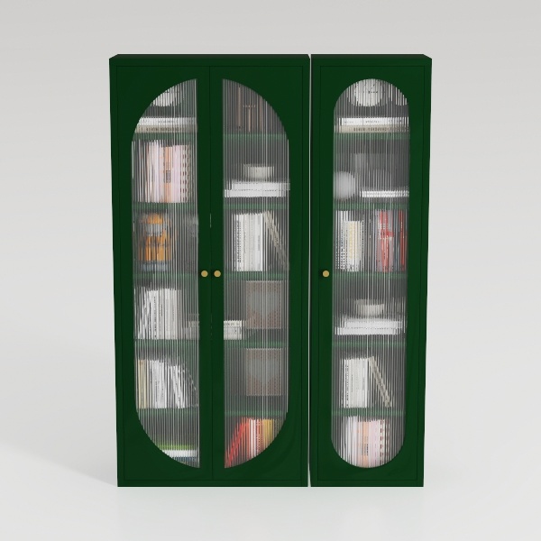 Blending mid-century charm with modern minimalism, this green cabinet blends smooth, warm wood with ribbed glass doors—subtly textural, filtering light gently. Inside, organized books and small decor create a cozy, curated look. Ideal for a classic study or living room, it pairs with wooden side tables and potted ferns, while ample storage and gold handles add both utility and timeless appeal.
