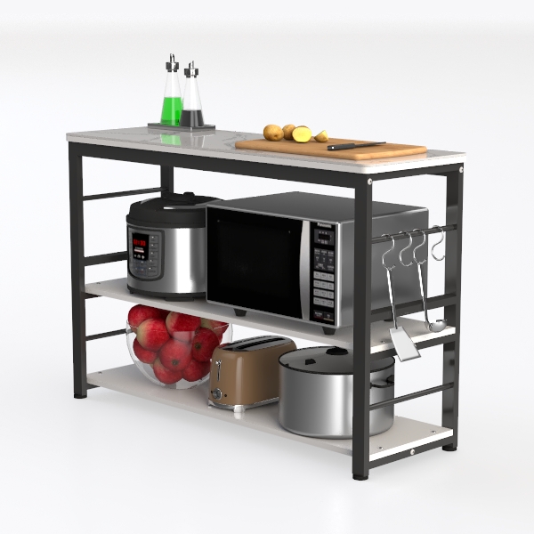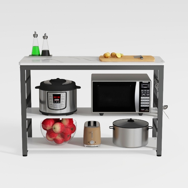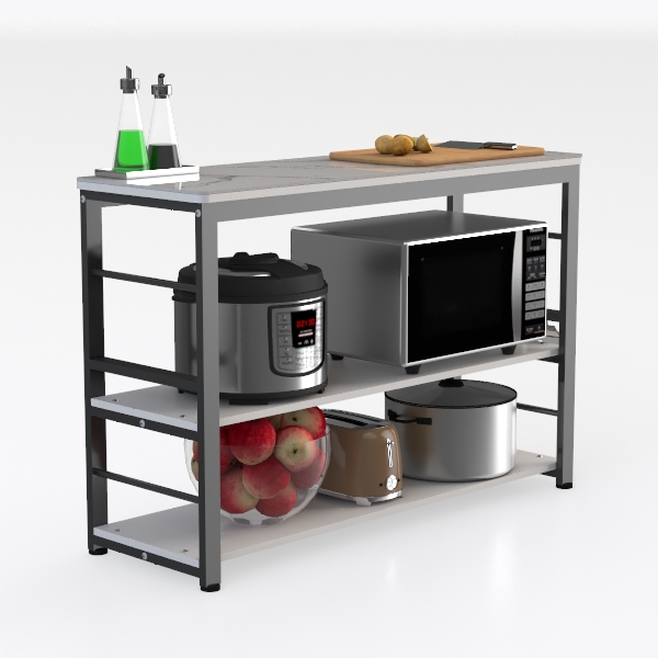 Designed for modern small kitchens, blending minimalist aesthetics with practical storage. Its sleek marble top adds elegance, while sturdy metal frames ensure durability, and white shelves keep the look clean. Lower shelves fit appliances like a pressure cooker, microwave, and toaster, with a fresh apple bowl enhancing warmth. Ideal for clutter-free, functional cooking spaces, perfect for daily meal prep.