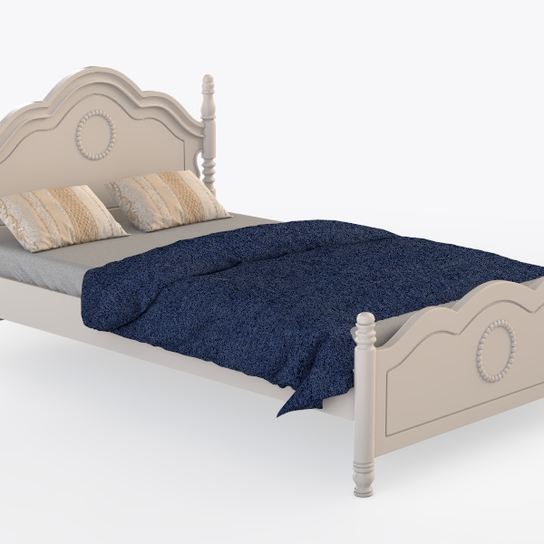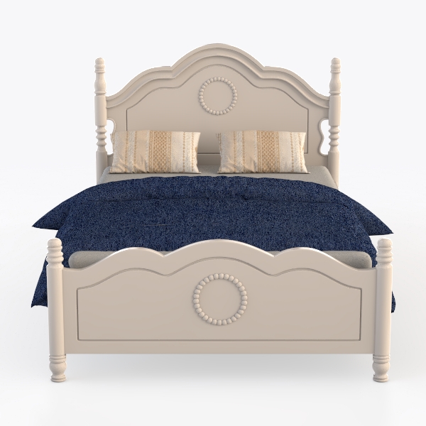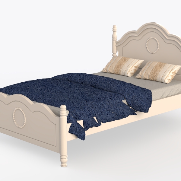 Inspired by classic European furniture, the bed blends timeless elegance with modern comfort. Its light beige wooden frame, polished to a smooth finish, features intricate circular bead details on the headboard and footboard, adding soft visual texture. The curved silhouette, paired with deep blue textured bedding, creates a warm, inviting atmosphere, perfect for a vintage-inspired bedroom. Sturdy wooden posts ensure stability, prioritizing both style and comfortable sleep.