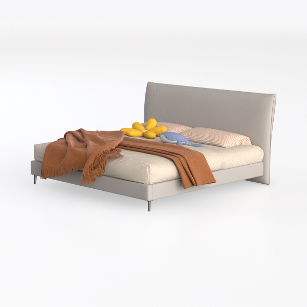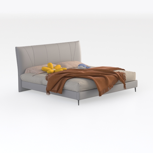 Inspired by contemporary minimalism, this bed blends a smooth, soft leather headboard with crisp linen sheets, creating a warm, inviting feel. Clean lines and light neutral hues enhance calm, ideal for a cozy modern bedroom paired with earthy throws and playful decor. Sturdy metal legs elevate the frame, offering ample space and comfort for restful nights.