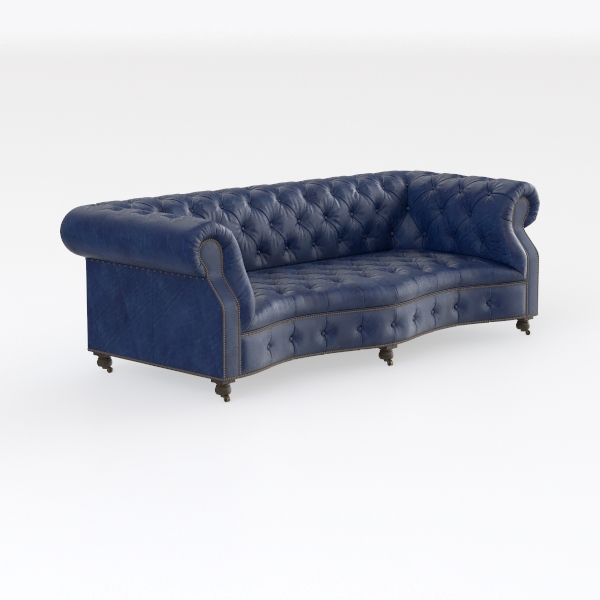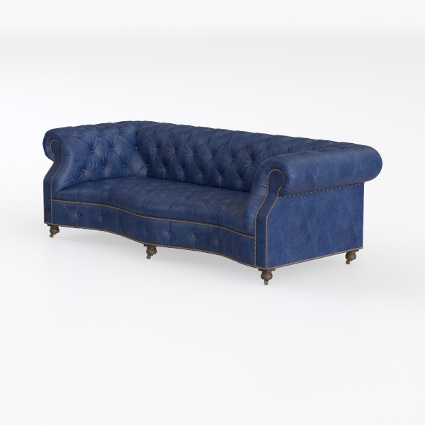 This elegant sofa takes cues from the timeless allure of 18th-century British Chesterfield designs, merging classic grace with modern comfort. Crafted from a sumptuous deep indigo leather, its surface feels rich and slightly textured to the touch—soft enough to sink into, yet sturdy enough to withstand daily use. The intricate diamond tufting creates gentle, inviting dimples that catch light, casting subtle shadows that add depth, while the curved arms and rolled edges evoke a sense of old-world luxury. The contrasting gold topstitching along the seams and the slim, turned wooden legs (finished in a warm honey tone) elevate the design with refined details.