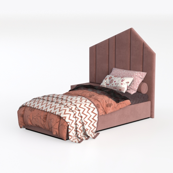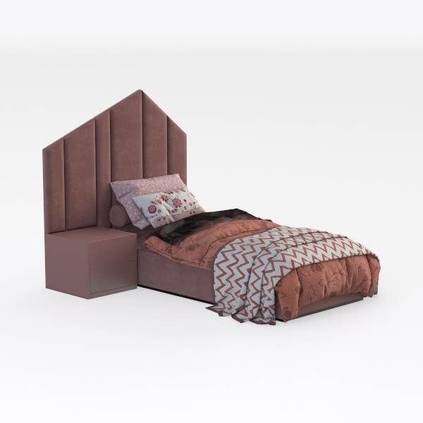 Designed with soft geometric lines and warm earthy tones, this bed blends modern minimalism with gentle charm. The plush, velvety headboard offers a comforting touch, while the bedspread—adorned with floral and zigzag patterns—adds soft visual warmth. Ideal for a cozy kids' or teen's bedroom, it pairs with wooden nightstands and soft lighting, ensuring a serene, inviting space. The supportive headboard and lightweight, breathable fabric enhance daily comfort.