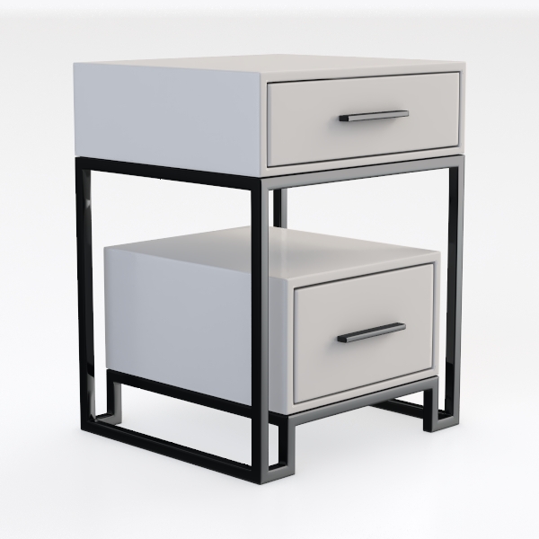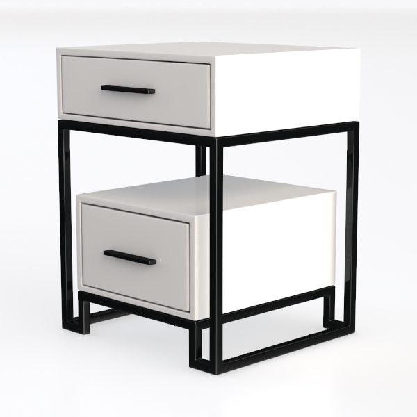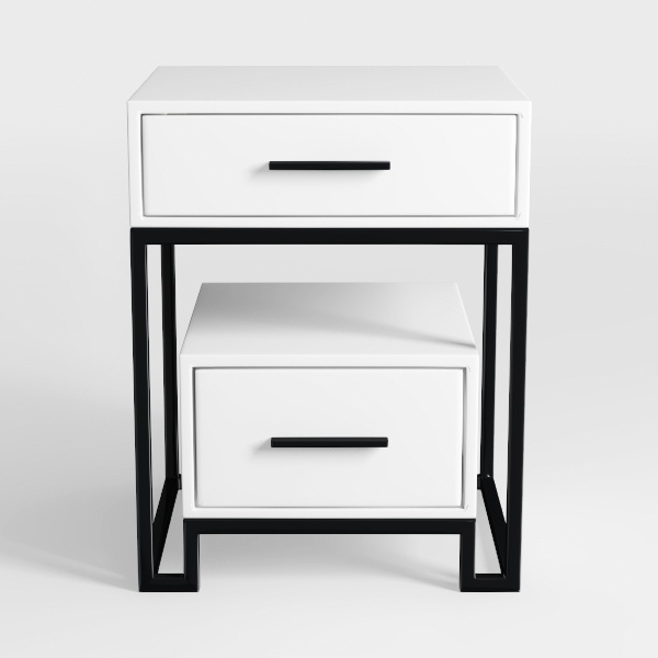 Inspired by minimalist Scandinavian design, this two-drawer nightstand features sleek white drawers with a smooth matte finish, paired with matte black metal frames for a clean, contemporary look. Its lightweight yet sturdy structure adds stability, while the two drawers provide ample storage for bedtime essentials, ideal for a modern minimalist bedroom, complementing soft linen bedding and warm wooden floors.