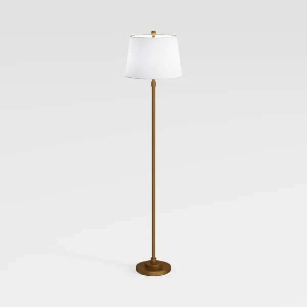 A 3D model of a Floor Lamp, featuring brass-finished metal stand, white linen shade, and round base, with a modern minimalist aesthetic. It has low polygon count and is suitable for living rooms or bedrooms.