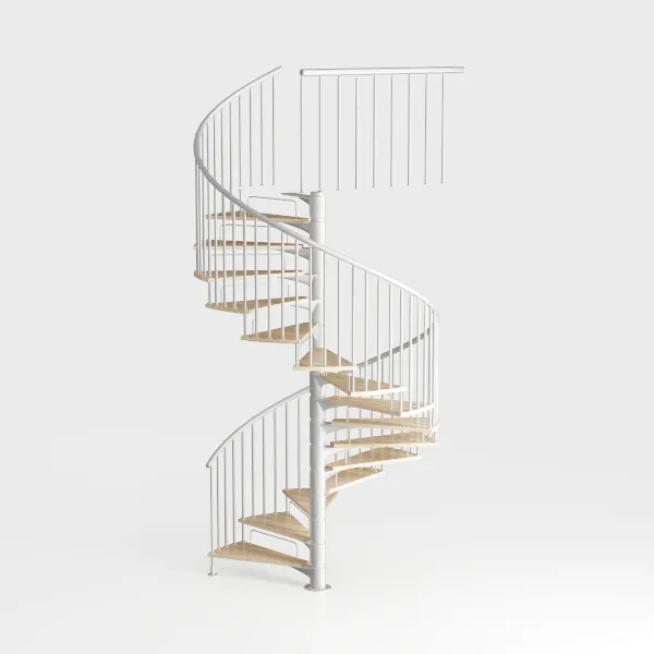 A 3D model of a spiral staircase, featuring white metal handrails and light wooden steps, with a modern minimalist aesthetic. It has low polygon count and is suitable for interior design or architectural use.