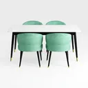 Inspired by mid-century modern and contemporary minimalism, this dining set features a smooth white marble top and plush mint-green upholstery. The soft fabric feels gentle to the touch, with clean lines and harmonious color contrast creating a fresh, elegant look. Ideal for a modern minimalist dining room, it pairs well with metallic accents like gold lamp bases, while the plump seats and spacious tabletop ensure both style and comfort for family meals.