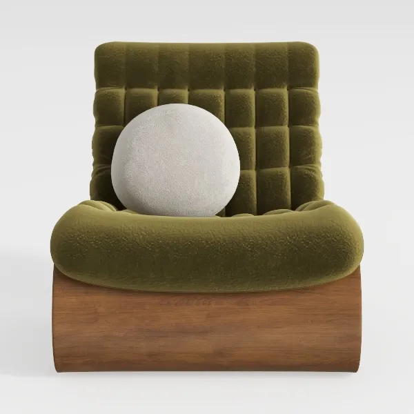 This armchair merges mid-century-inspired warmth with contemporary comfort, drawing design cues from organic, flowing forms and a balance of softness and structure. Its rich, olive-green upholstery features a subtle, quilted pattern that feels luxuriously plush to the touch—warm and inviting, like sinking into a cloud. The rounded, off-white lumbar pillow adds a gentle contrast, enhancing the piece’s cozy, hug-like quality, while the smooth, honey-toned wooden base grounds it with a natural, earthy stability, its visible grain adding texture. Visually, the chair’s curved silhouette and muted color palette create a serene, harmonious vibe, softening any space with understated elegance.