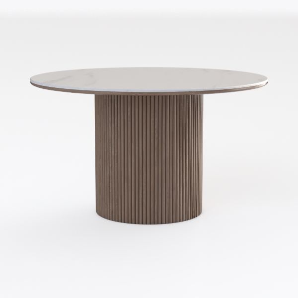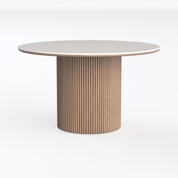 This round table merges organic softness with structured geometry, drawing inspiration from the quiet dialogue between smooth curves and crisp vertical lines in minimalist design. The tabletop, a sleek, matte white surface, feels cool and smooth to the touch—its polished finish catching light gently, while the cylindrical base, carved with vertical fluted details, adds textural depth. The warm, earthy wood grain of the base contrasts subtly with the white top, creating a balanced interplay of light and shadow that enhances its presence.
