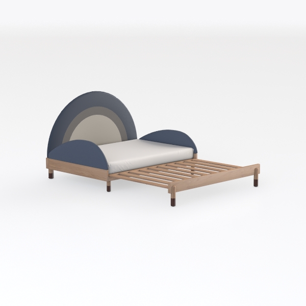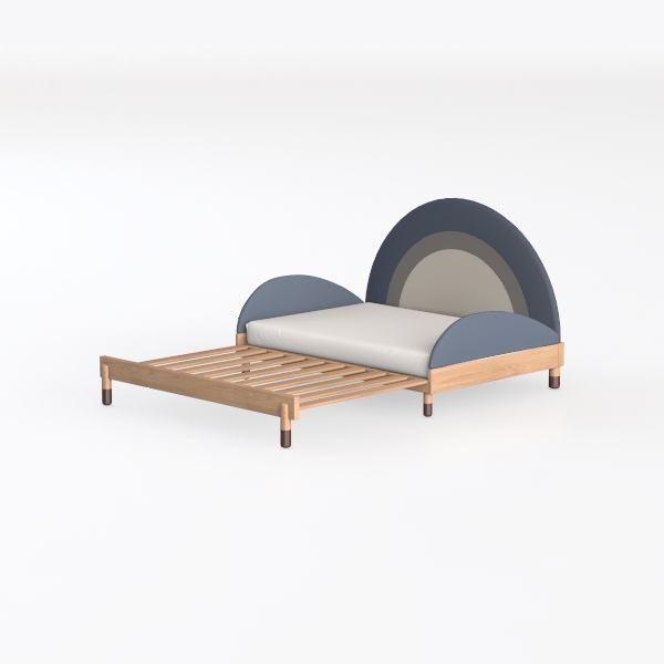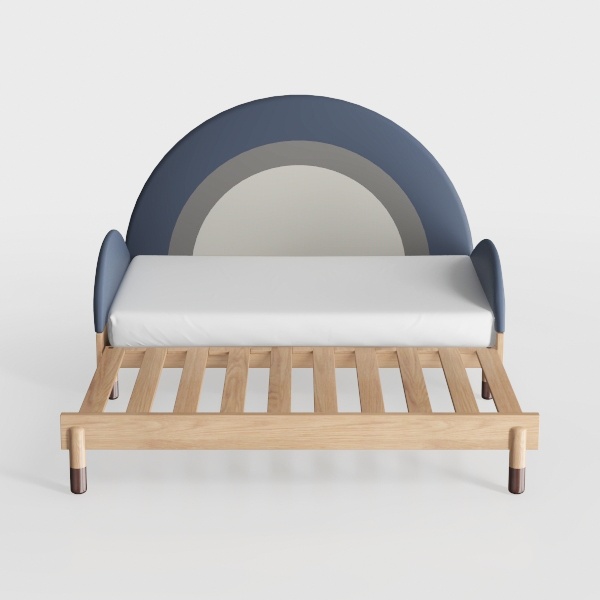 This piece draws inspiration from the organic curves of nature, with its gently arcing headboard mimicking the soft, flowing lines of a crescent moon or a dewdrop. The color palette—blending deep blue, soft gray, and warm beige—echoes the serene transitions found in twilight skies, infusing the design with a calm, inviting energy.