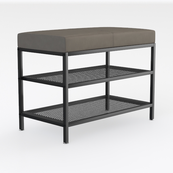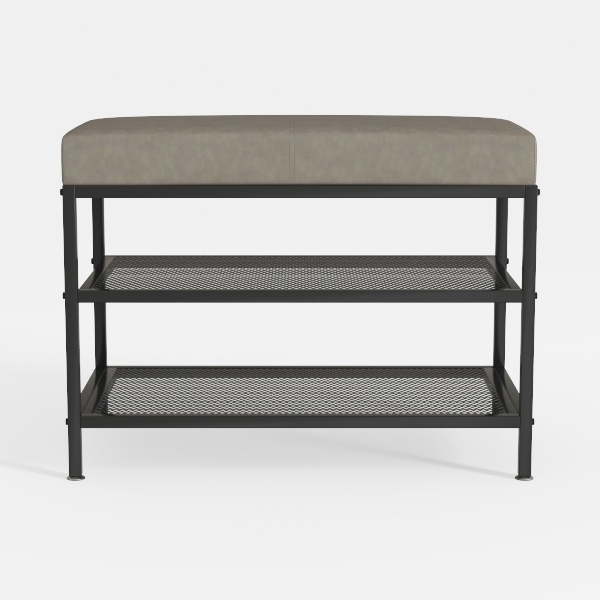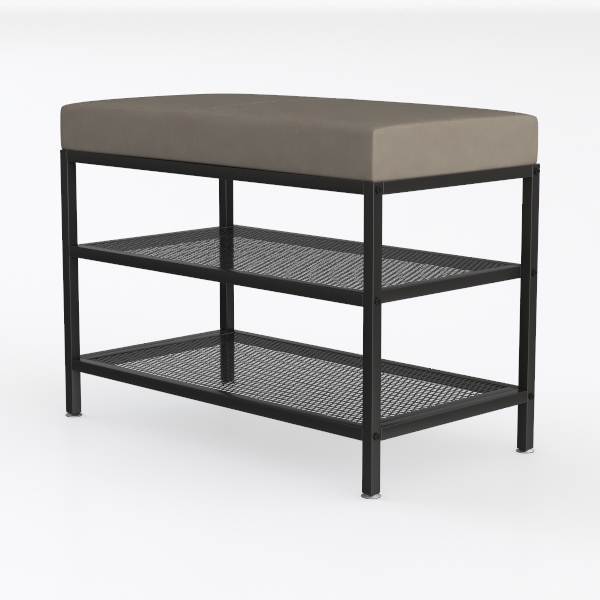 This piece merges minimalist practicality with understated elegance, drawing design inspiration from the balance of raw structure and tactile comfort. The soft, taupe upholstered top features a smooth, slightly textured surface that invites relaxation—plush yet supportive, it offers a cozy spot for sitting, whether as an entryway rest or a footstool by the bed. Below, a matte black metal frame, with clean, straight lines and a lightweight, airy feel, grounds the design. The two lower shelves, crafted from diamond-patterned mesh, add both visual interest and functionality: their openwork allows light to pass through, preventing clutter from feeling overwhelming, while the sturdy metal construction ensures reliable storage for shoes, folded linens, or decorative objects.