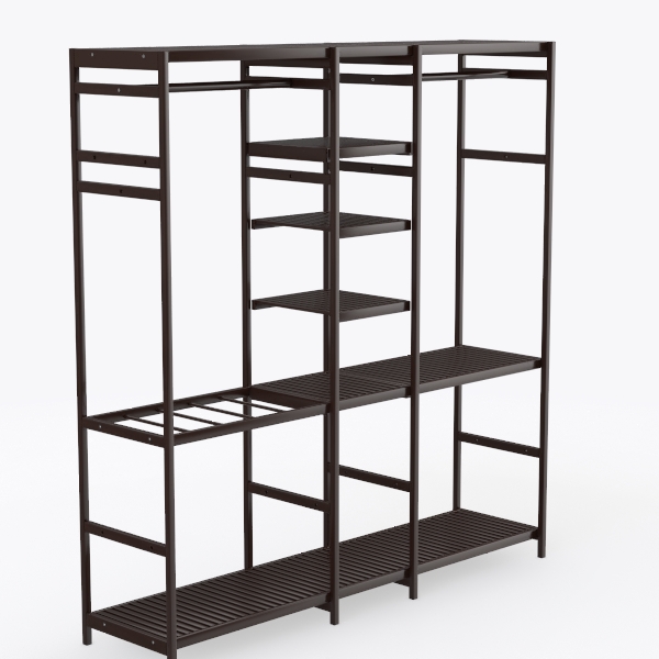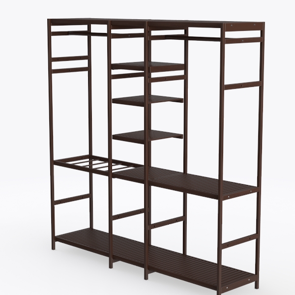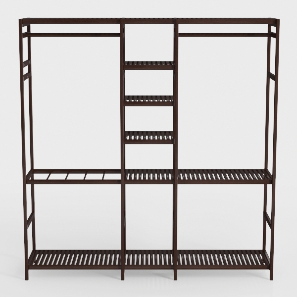 This furniture piece draws inspiration from the balance of geometric minimalism and organic functionality, embodying a design philosophy that prioritizes clean lines and practical space utilization. Crafted with a smooth, dark brown finish, its frame exudes a warm yet refined aesthetic, with a matte texture that feels solid and substantial to the touch. The structure features a symmetrical layout, with vertical supports and horizontal shelves creating a sense of order, while the central ladder-like section adds a subtle, functional accent that eases access to higher storage areas. Visually, it projects a calm, grounded presence, its dark hue complementing both light and neutral-toned room settings, and its open design allowing light to filter through, preventing a cramped feel.