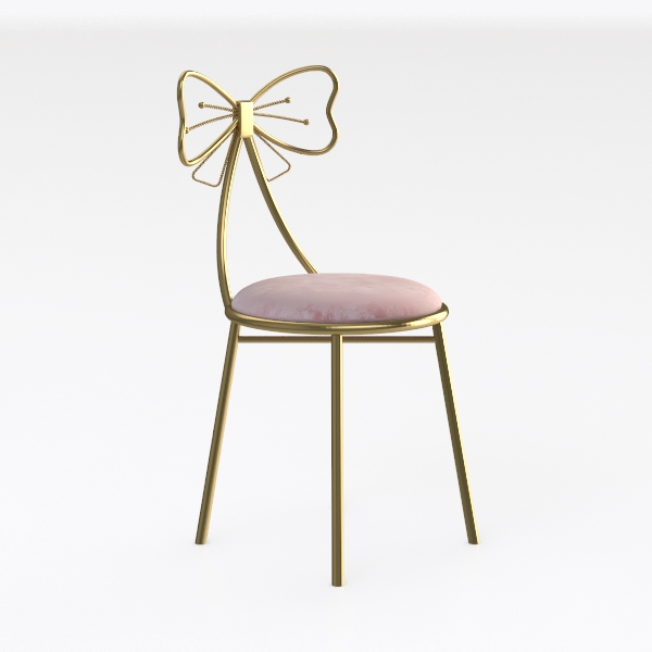 Inspired by romantic, vintage charm, this piece features a delicate bowback design that adds a playful yet elegant touch to any space. The gold-plated metal frame shimmers softly under light, with clean, curved lines that flow gracefully from the base to the statement bow, creating a sense of lightness and sophistication. The seat is upholstered in a plush, soft pink velvet cushion, its warm texture inviting a gentle touch and offering a cozy contrast to the sleek metal. Visually, the golden tones complement the blush hue beautifully, balancing modern minimalism with a hint of nostalgic sweetness.