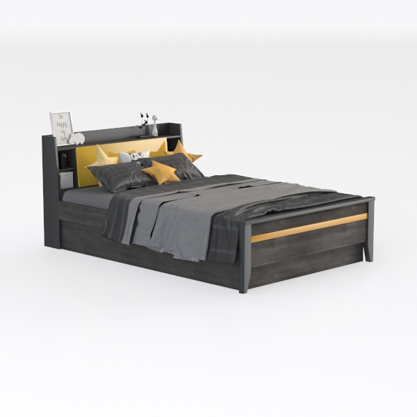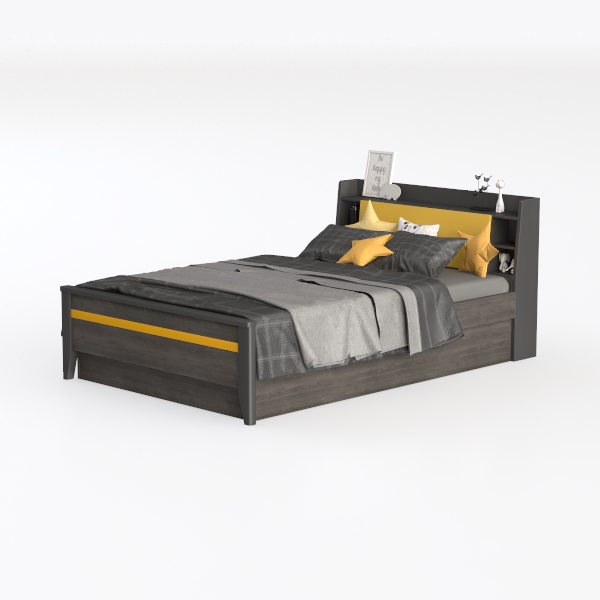 This bed design draws inspiration from the harmony of modern simplicity and warm, uplifting energy, aiming to create a space that feels both serene and vibrant. The frame features a smooth, matte finish in soft gray wood tones, with subtle grain patterns that add natural texture without clutter, while the headboard contrasts with a bright, cheerful mustard-yellow panel—like a sunlit accent that sparks warmth.