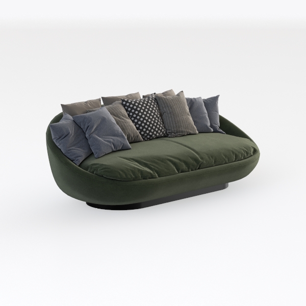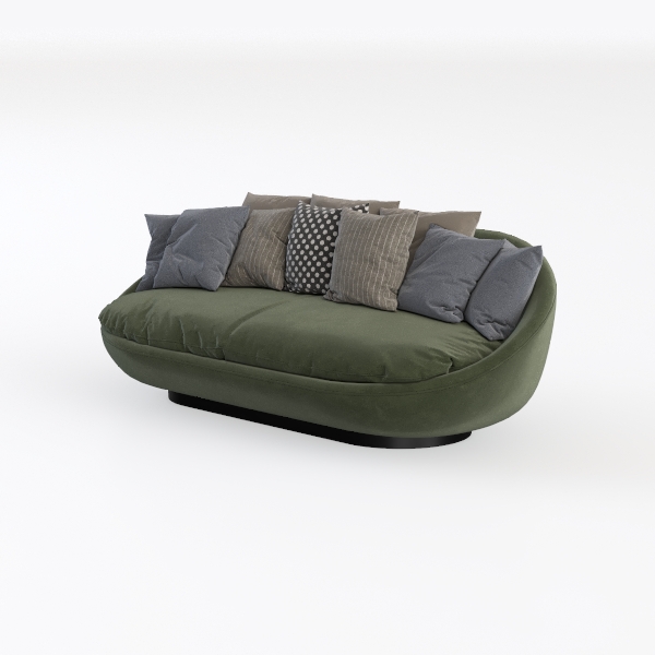 Inspired by modern organic forms, this inviting sofa brings a sense of calm and sophistication to any living space. The deep green upholstery, resembling plush velvet, invites you to sink into its embrace, offering a tactile experience that is both soothing and luxurious.