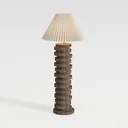 A 3D model of a floor lamp, featuring a woven rattan shade with punched holes and black metal tripod stand, in a minimalist modern aesthetic. It has highly detailed clean lines and is suitable for home decor in living rooms or bedrooms.
