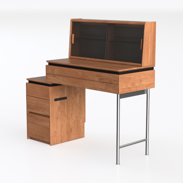Inspired by mid-20th century Scandinavian functionalism, this piece blends minimalist aesthetics with practical design. Crafted from warm-toned wood, its surface reveals rich, natural grain patterns that add depth and a tactile sense of warmth. The wood’s smooth finish invites gentle touches, while the slender metal legs—sleek and silver—provide a striking contrast, balancing the softness of the wood with a modern, industrial edge. The top features a lift-up glass-paneled cabinet, allowing for discreet storage of cherished items while keeping them visible, and a spacious drawer below offers easy access to smaller essentials. A compact lateral cabinet with three stacked drawers adds additional storage, perfect for organizing stationery or personal belongings. This versatile desk seamlessly fits into modern, Scandinavian, or retro-modern spaces—whether in a study, bedroom, or living room corner. Its clean lines and thoughtful proportions make it not just a functional workspace, but a design focal point that elevates any room with understated elegance and timeless appeal.