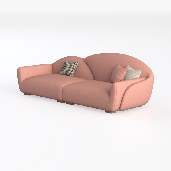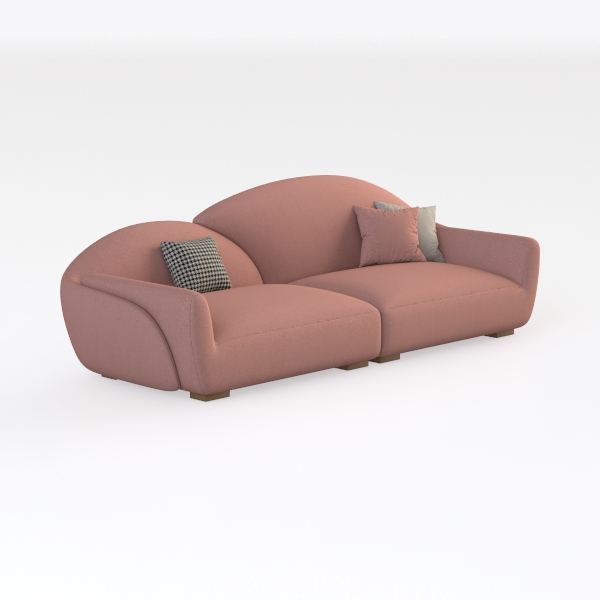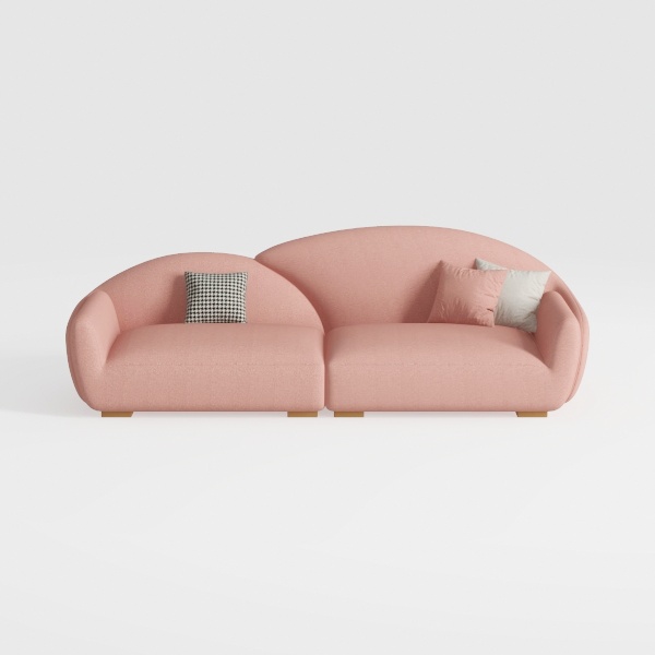 Inspired by contemporary design, this elegant sofa captures a blend of comfort and aesthetic appeal. Its soft, rounded edges and plush upholstery create a cozy atmosphere, inviting relaxation and warmth. The delicate pink hue adds a touch of playfulness, while the contrasting pillows introduce a subtle texture with their patterned and solid finishes.
