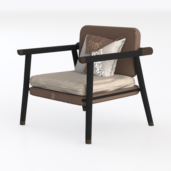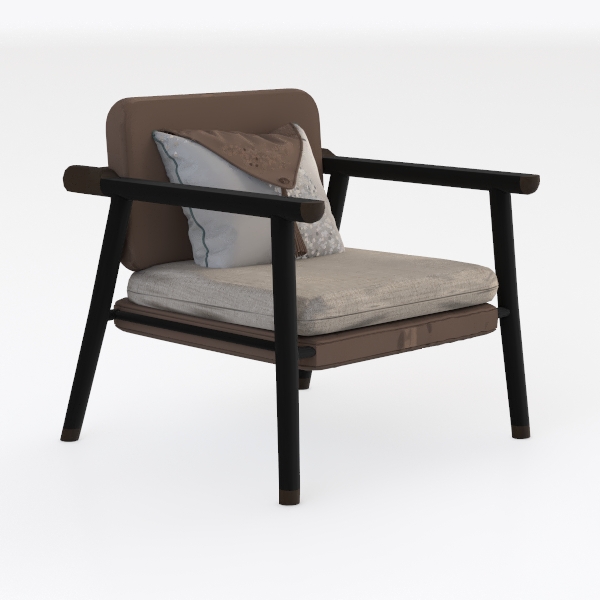 This armchair embodies a fusion of mid-century modern minimalism and organic warmth, shaped by soft, flowing lines that balance structure and comfort. The frame, crafted from smooth, dark wood with a matte finish, adds a cool, architectural contrast to the chair’s plush upholstery. The backrest and seat are wrapped in a textured beige fabric—light, breathable, and subtly woven, offering a soft, tactile feel that invites relaxation. A terracotta cushion with a delicate, abstract pattern sits atop the seat, infusing warmth and depth, while the gentle curve of the backrest follows the natural line of the spine.