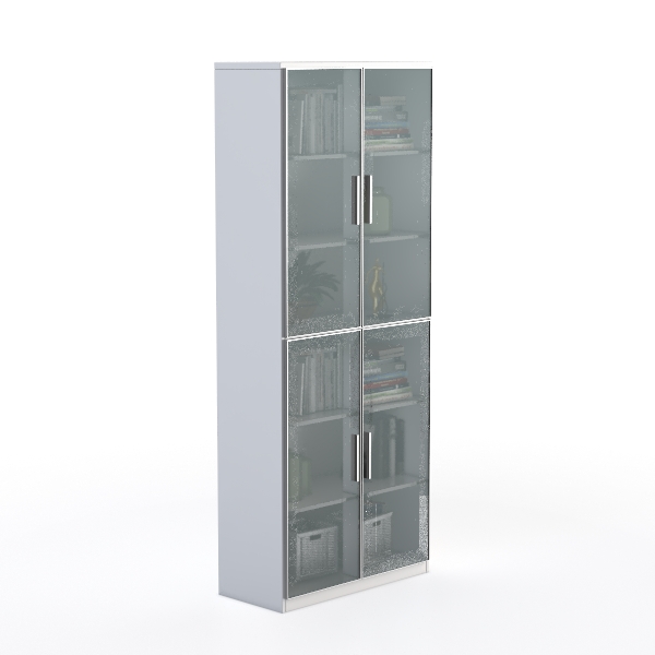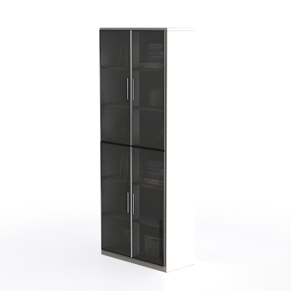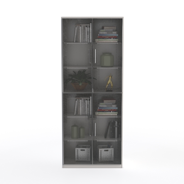 This bookshelf merges minimalist aesthetics with practical design, drawing inspiration from the clean lines of modern architecture and the need for organized living. Its frame, crafted from a smooth, matte material with thin metallic trim, exudes understated elegance, while the clear glass panel doors add transparency, making the contents within feel like an integral part of the decor. The visual allure lies in the contrast between the neutral base and the vibrant touches—stacked books in earthy tones, the rich green of potted plants, and the soft texture of woven baskets below—creating a balanced, inviting atmosphere.
