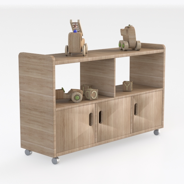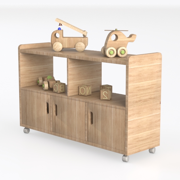 This wooden storage unit draws inspiration from a blend of natural aesthetics and child-centric functionality, seamlessly integrating into spaces designed for both play and order. Its light, warm oak finish features subtle, visible wood grain, creating a soft, inviting texture that feels gentle to the touch—smooth and polished, yet retaining the organic charm of natural materials. The clean, minimal lines and open shelving on the top layer balance simplicity with playfulness, while the lower cabinetry adds a practical, closed storage solution, keeping small toys and accessories neatly contained.