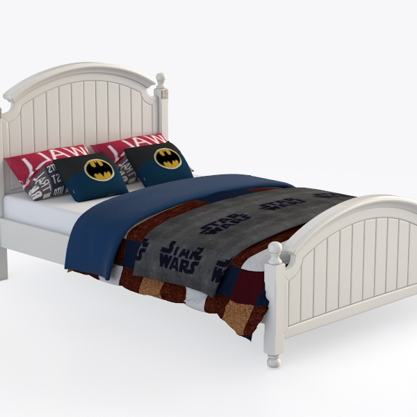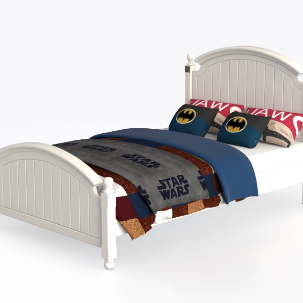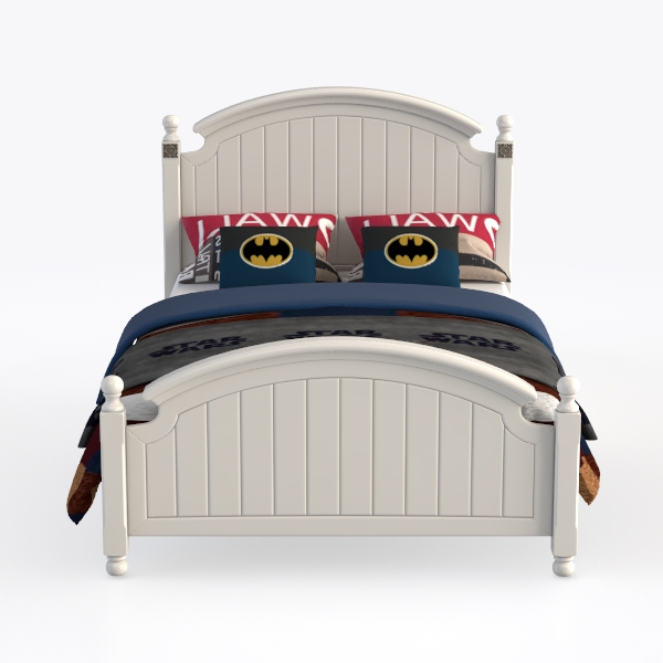 This charming bed frame takes inspiration from the vision of crafting a children’s space that blends timeless warmth with playful personality, merging classic design elements with modern comfort. Crafted from smooth, painted wood, its soft white finish radiates a clean, airy vibe, while gently curved headboard and footboard add subtle sophistication through flowing lines. The vertical slats on the frame offer delicate texture, allowing the vibrant bedding—adorned with bold superhero motifs—to take center stage, creating a lively yet balanced look.