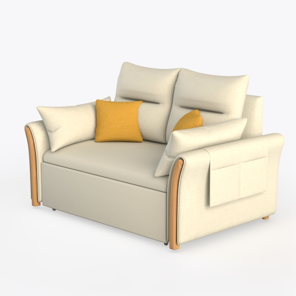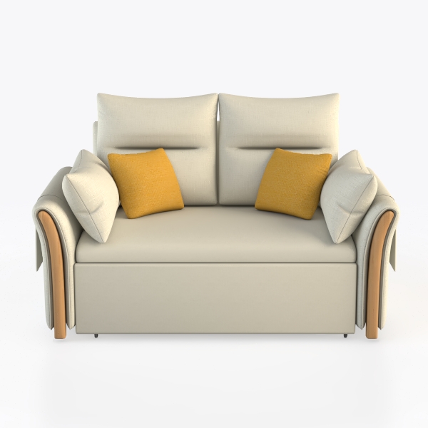 This elegant loveseat embodies a contemporary design inspired by minimalism and comfort. The soft beige upholstery invites you to unwind, while the addition of vibrant yellow accent pillows adds a pop of color, enhancing the visual appeal and creating a warm atmosphere. The gently curved wooden arms not only provide a touch of sophistication but also ensure a tactile experience, making it a pleasure to relax against.