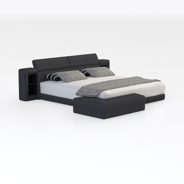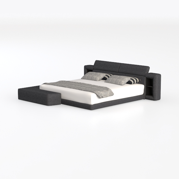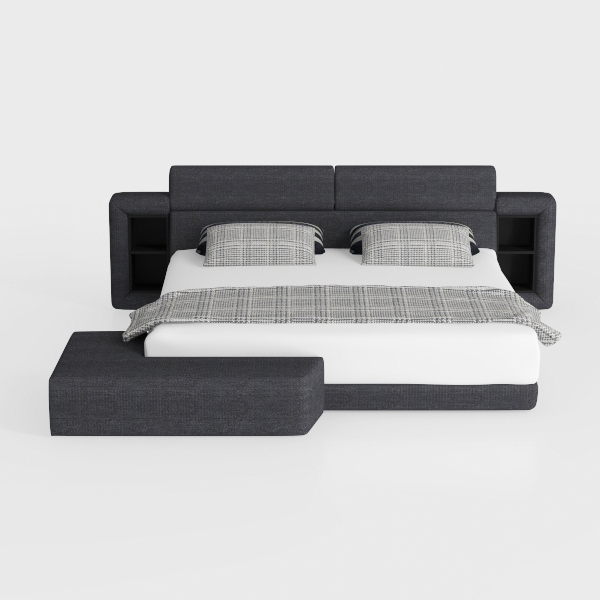Functionality is at its core: integrated side shelves flanking the headboard offer handy storage for睡前读物, a phone, or a small lamp, while the footboard, paired with a matching bench, provides extra seating or a convenient surface for placing clothing. The design avoids overcrowding, instead focusing on creating a serene sanctuary where comfort and style coexist effortlessly.