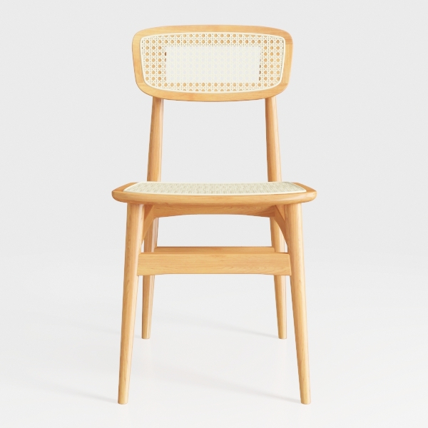 Crafted with a warm nod to mid-century design, this chair takes inspiration from the simplicity of natural materials and the functional beauty of 20th-century furniture. Its frame, in a soft, light oak hue, showcases subtle wood grain, grounding the piece in organic warmth, while the backrest and seat feature a delicate woven pattern—likely rattan or similar fibers—adding textural contrast and visual airiness.