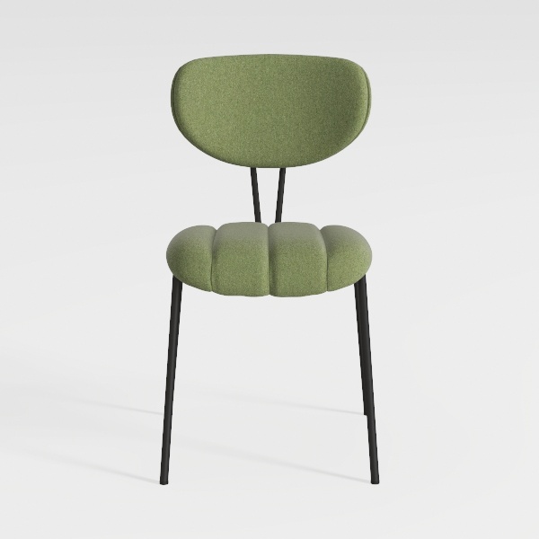 This chair embodies a seamless fusion of organic inspiration and modern minimalism. Its design draws from the fluidity of natural forms—think the gentle, undulating curves of a leaf or the soft arcs of a flowing stream—resulting in a piece that feels both intentional and effortlessly balanced. The upholstery, a muted sage green fabric, features subtle, wave-like creases that add tactile depth: plush yet springy, it cradles the body with quiet comfort, while the curved backrest, tapering slightly at the top, follows the natural curve of the spine, ensuring support during extended sits. The slender black metal legs, with their elegant V-shape at the back, contrast the solid upholstery, balancing lightness with stability, so the chair feels both substantial and airy.