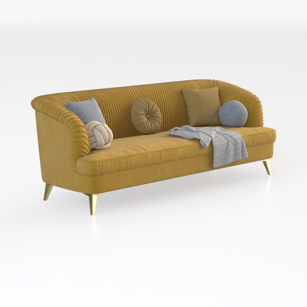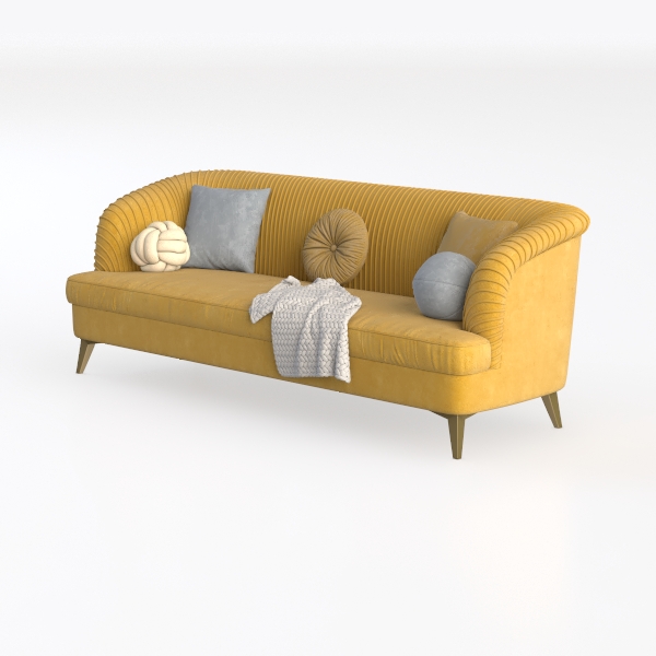 This bright yellow sofa embodies a playful yet sophisticated design, inspired by mid-century modern aesthetics. Its inviting texture, characterized by soft, pleated upholstery, not only enhances its visual appeal but also adds a cozy touch. The combination of smooth and plush materials invites you to settle in and relax, creating an inviting atmosphere in any living space.